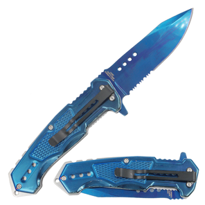 14487 - Defender-Xtreme 8.5" Blue Titanium Coating Serrated Blade Spring Assisted Folding Knife 3CR13 Steel
