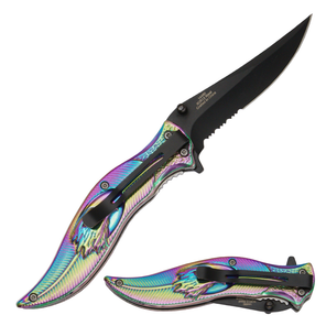Spring Assisted Folding Knife 8.5" Overall Length 3.5" Blade Length 5" Handle Length Rainbow Titanium Coating Knife Rainbow Color Leaf Style Handle Black Blade 3CR13 Steel Serrated Blade Belt Clip Ultra Sharp Blade Flexible for...