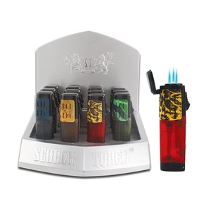 3.5" Scorch Triple Torch with See-Thru Butane - (61767-3T)•    See Through Butane•    Cigar PunchColor: AssortedHeight" 3.5"Design: Assorted Print BlackQuantity: 12 Pcs / DisplaySold by Display!