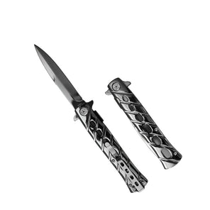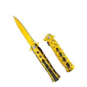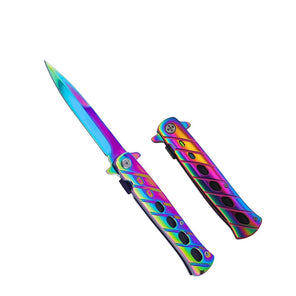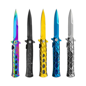 9" Folding Knife4" 440 Stainless Steel bladecomfortable 5" handleAvailable in Black, Blue, Gold, Rainbow, and SilverSold Individually!