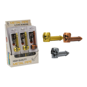 Sculpted skull bowl with bullet-style pipe body Made from solid heat-resistant metal Available in gold, silver, and copper colorways Easy-to-clean detachable components Includes 5 pipe screens per unit – blister packed for resale Great for...