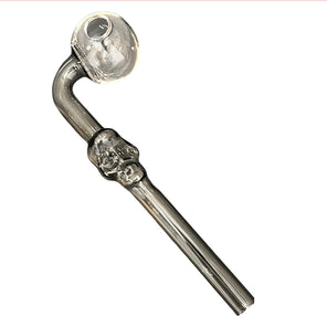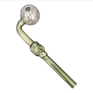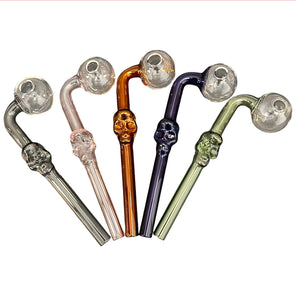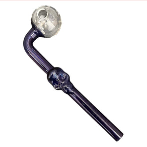 Oil Buner with Skul *Style: Pipe*Material: glass*Thickness: 4MM(pipe) *Thickness: 3MM (Bowl) *Height: 5 InchesAssortedSold by pack!