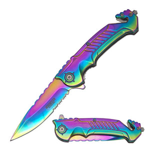 14475 - Defender-Xtreme 9" Rainbow Titanium Coating Serrated Blade Spring Assisted Folding Knife 3CR13 Steel