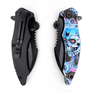 - 14641 - Defender-Xtreme 7.85" Skull Design ABS Handle Blue 3CR13 Steel Spring Assisted Folding Knife