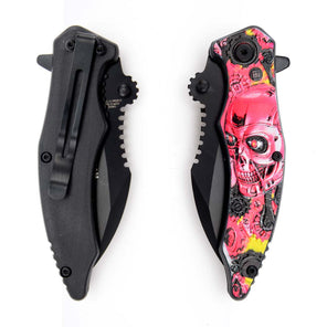 - 14642 - Defender-Xtreme 7.85" Skull Design ABS Handle Red 3CR13 Steel Spring Assisted Folding Knife