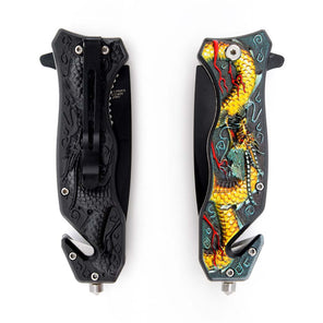 - 14637 - Defender-Xtreme 8.7" Dragon Design ABS Handle 3CR13 Steel Spring Assisted Folding Knife