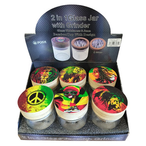 Built-in grinder under the eco-friendly bamboo lid Durable 3.2mm thick airtight glass for freshness Reggae-themed prints: Rasta lions, peace signs, Bob Marley tributes Compact, portable, reusable, and great for travel Ideal for storing herbs, tea,...